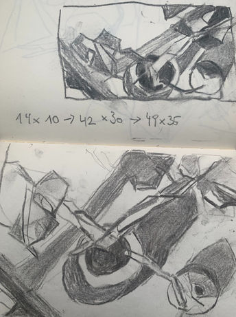 Die „große Form“ besteht vor allem in den Beziehungen der beiden Figuren zueinander: die Ausrichtung der Köpfe, der Nasen, der Schultern und Arme, der Verschiedenes haltenden Hände, des Unterkörpers und der Füße. Wie stehen die Leinwand im Bild und das lichte Buch zueinander, wie Trompete und Malstab, wie die Füße… Nicht nur der Fensterstandpunkt, auch die Perspektive dienen schon sehr lange als Vorlage. Mehr Freiheit und Erfindungsraum tun sich in der Schwebeschau auf, beim Vermeer-Versuch klingt das an: Der Malerschemel steht unten, die Staffelei ragt auf. Verbunden sind sie am Boden durch Licht und Schatten. Dazwischen der Maler mit seinem Modell, das er fast „leibhaftig“ auf sein Bild geholt hat. Im Zentrum die Hände und das, was sie halten: die linke Hand des Malers hält den Malstab, der sich von links unten nach rechts oben diagonal im Bildraum ausrichtet. Auf dem Stab liegt die rechte Hand behutsam auf, einen Pinsel schräg zum Malstab haltend. Der Pinsel liegt am Buch des Modells auf, das dieses wiederum mit seiner linken Hand umfasst hält. Hand und Buch führen zum rechten Arm des Modells, das in dieser Hand eine Trompete hält. Die horizontale Ausrichtung der Trompete steht in Beziehung zum aufsteigenden Malstab. D.h. es gibt verschiedene Richtungen zueinander, die den Raum gliedern und schaffen. Die verschiedenen Blickwinkel der Schwebeschau sind noch recht konventionell und gefällig wieder zusammengefügt - hier gibt es noch jede Menge Erfindungsspielraum in der Komposition. Die Farben bzw. Farbpartien/flächen dienen dem Gegenstand und orientieren sich an diesem. Der nächste Schritt besteht darin, die Komposition gewagter/ experimenteller/erfundener anzulegen und die Konturen aufzuweichen, indem der Weg des Lichts zum Thema wird, wodurch der konkrete Gegenstand sich unterordnet…